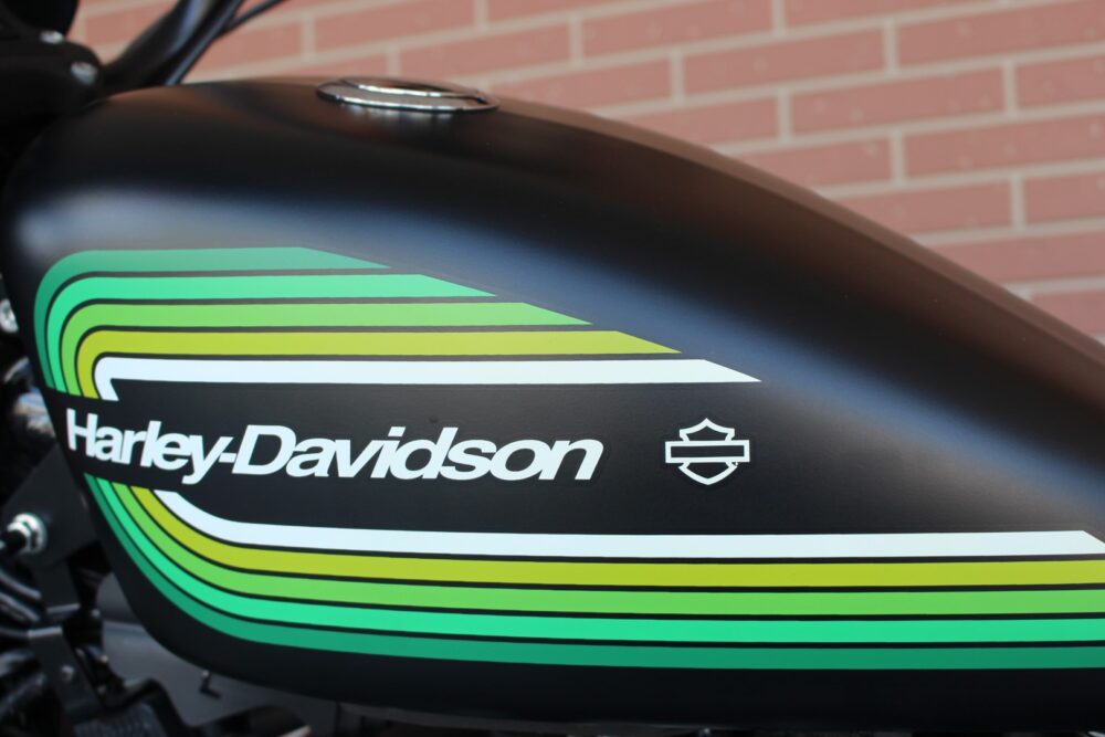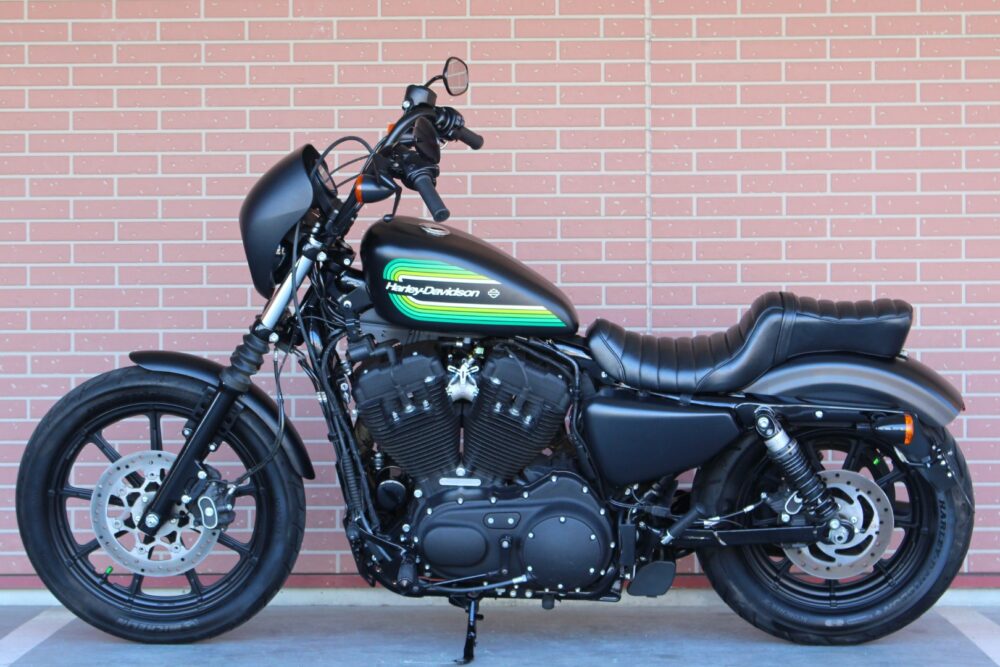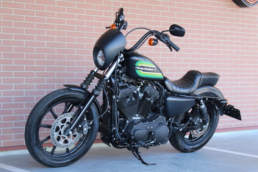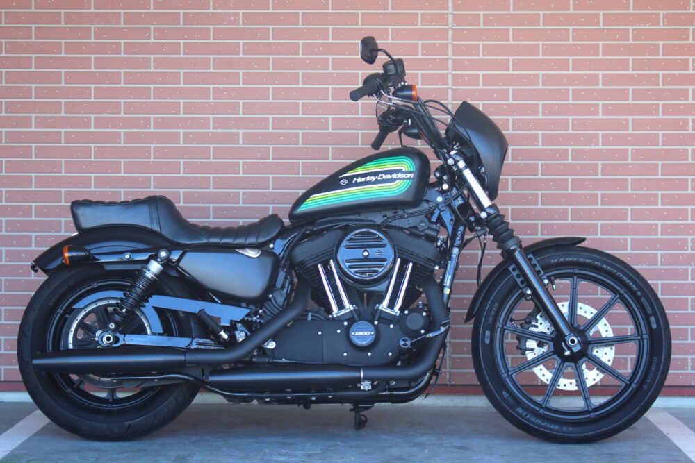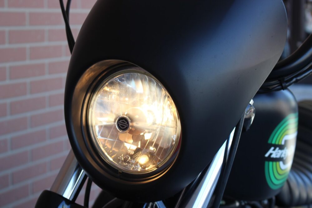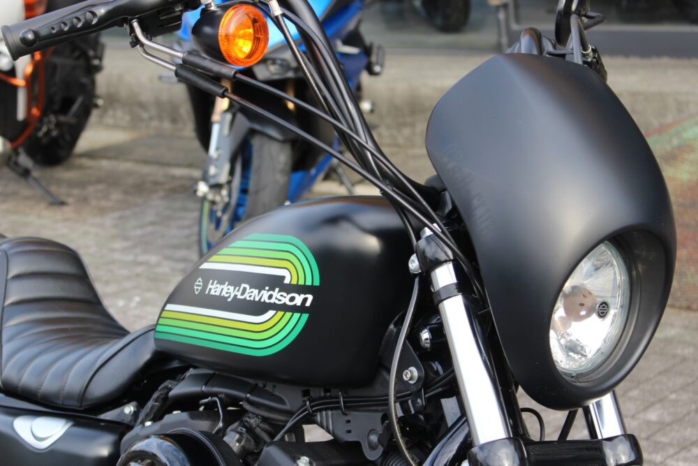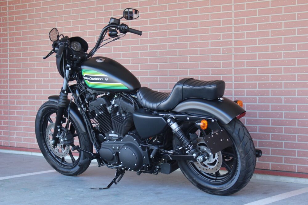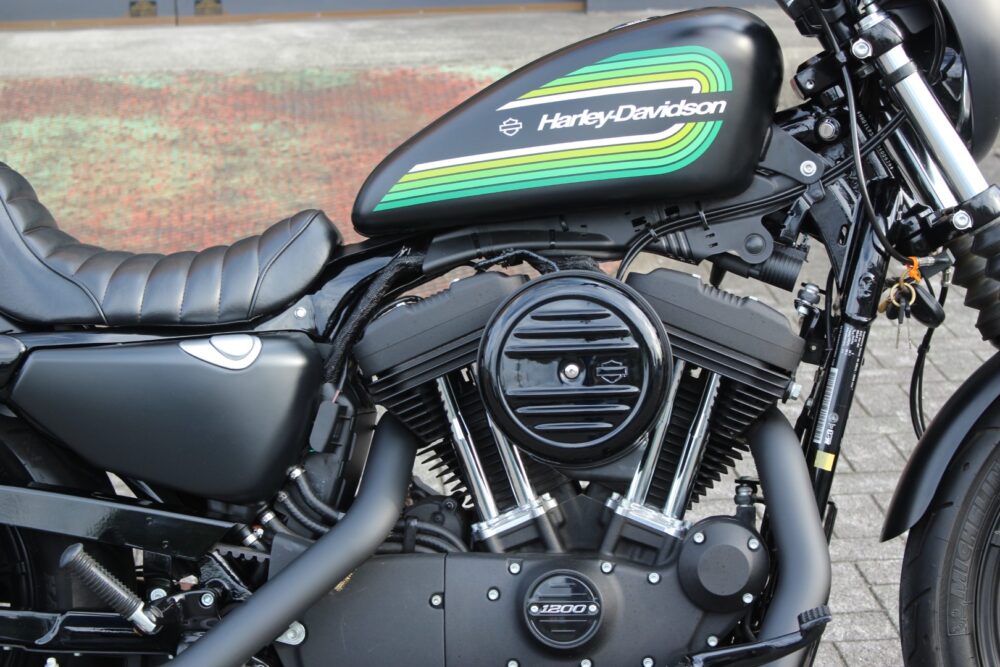 人気のアイアン1200NS1年間だけの製造カラーのブラックデニム&グリーンライン!二人乗り仕様、ヒートガードバンテージ、カルトワークバグスポイラー、ぺグ、グリップ、サイドナンバーなどカスタム!
