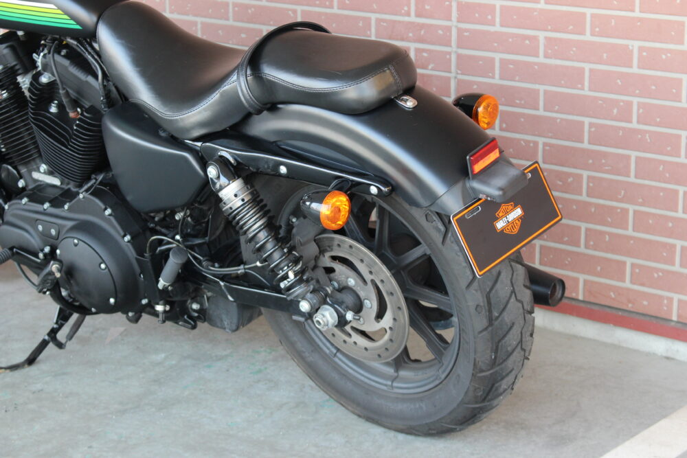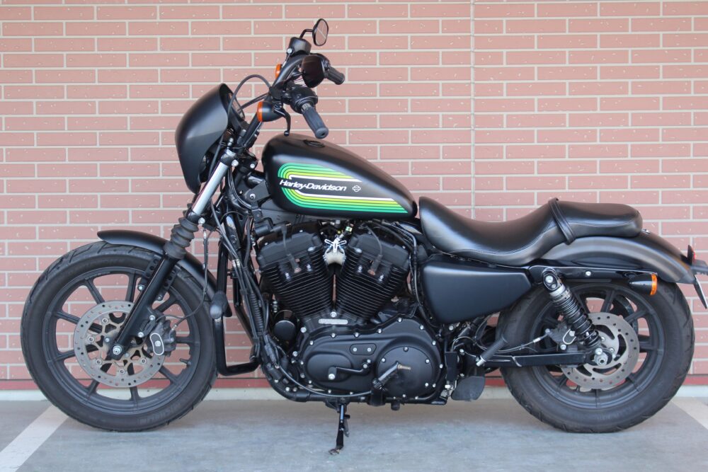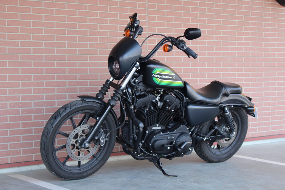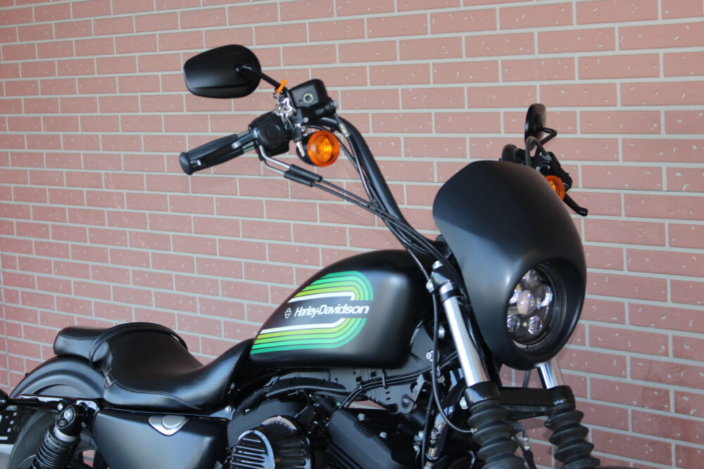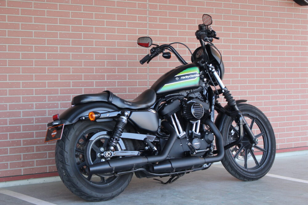 人気のアイアン1200マットブラックの入荷!マットブラック&ライムグリーンの線が施されている一台。LEDヘッドライト搭載、オベロンレバー、アレンネスエアクリーナー、ラペラ二人乗りシート、グリップ、フラッシュマウントなどカスタム多数!