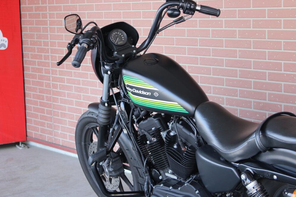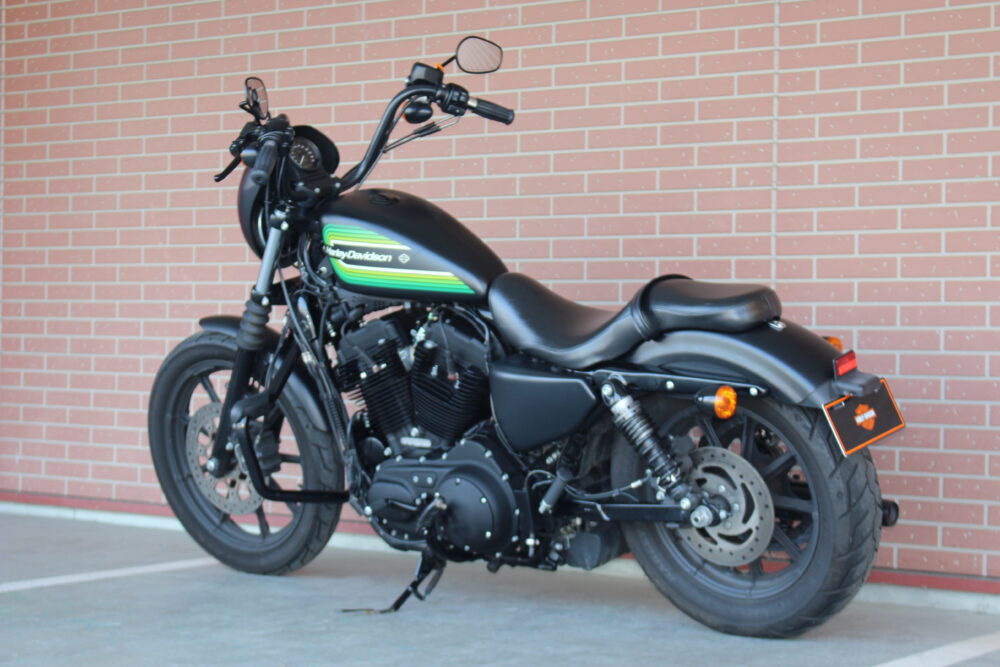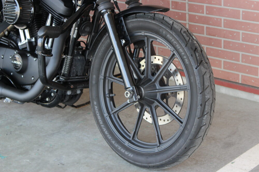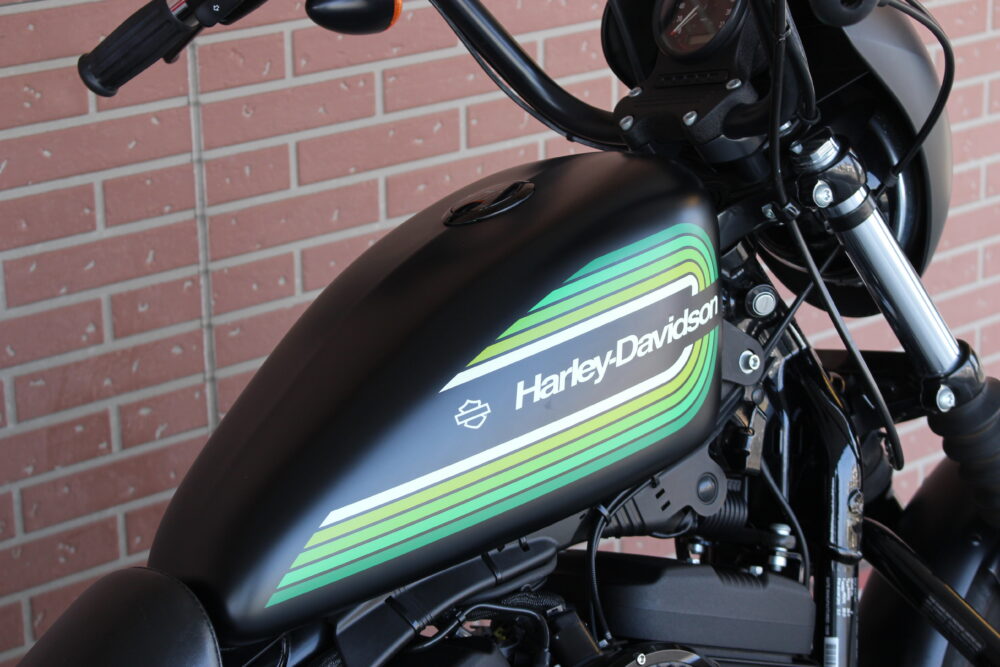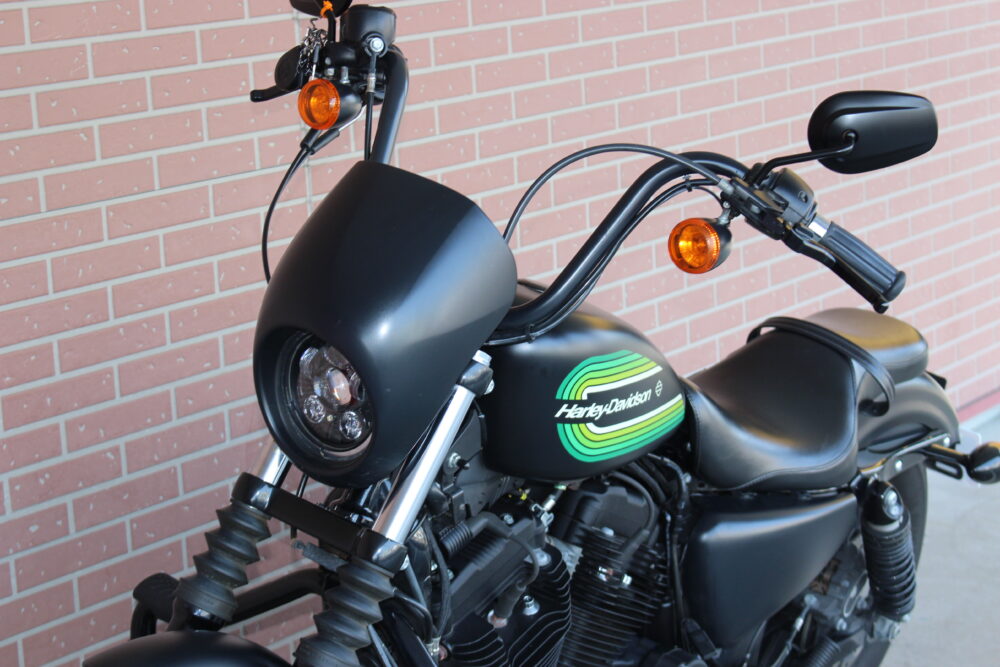 人気のアイアン1200マットブラックの入荷!マットブラック&ライムグリーンの線が施されている一台。LEDヘッドライト搭載、オベロンレバー、アレンネスエアクリーナー、ラペラ二人乗りシート、グリップ、フラッシュマウントなどカスタム多数!